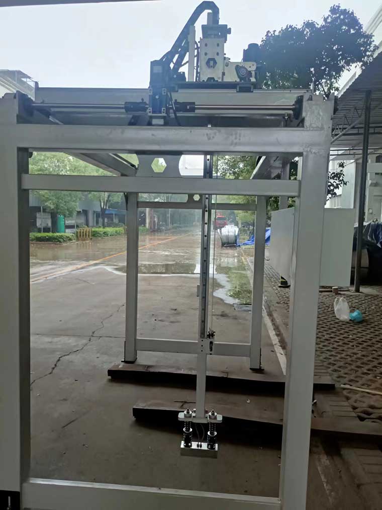 钢瓶码垛机械手采用电磁铁搬运钢瓶,机械手左右、上下行走采用伺服电机控制,在电控柜触摸屏上输入钢瓶直径参数后钢瓶码垛机械手就可自行计算左右、上下行走行走距离,从而达到精准码垛的效果。