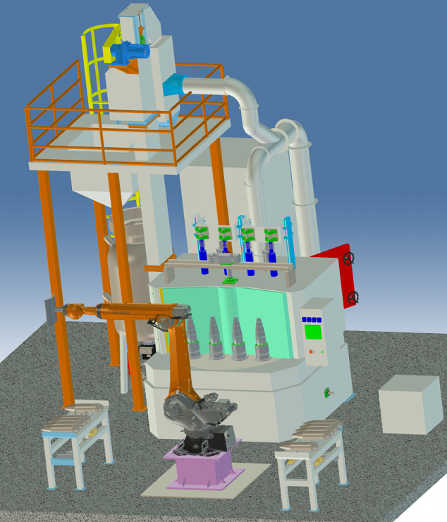功能:采用离心抛轮或压缩空气喷嘴,将弹丸加速至高速(60-100 m/s),定向喷射至炮弹壳内壁、外壁,覆盖全部表面。