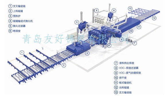 QXY钢板预处理线是将钢板在焊接加工前进行表面抛丸除锈并涂上一层保护底漆的设备,QXY钢板预处理线主要由钢材预热、抛丸除锈、喷漆、烘干等工部组成。