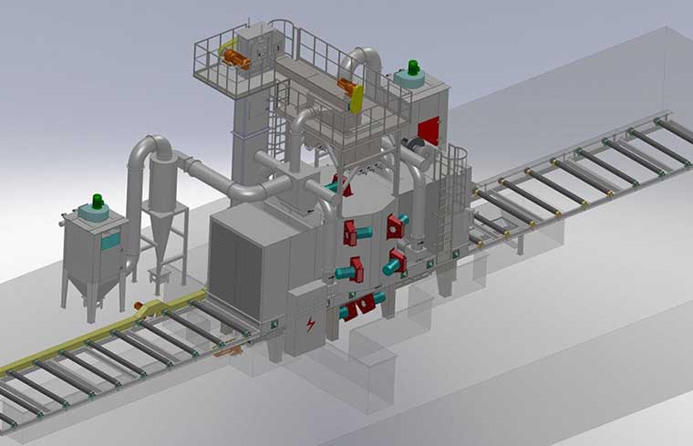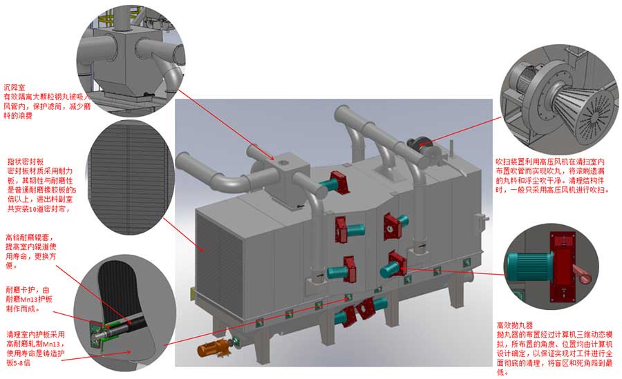 辊道通过式抛丸清理机主机主要有清理室、副室、清扫室、吹扫机构、抛丸器、清理室护板、输送辊道、挡砂门帘等组成。