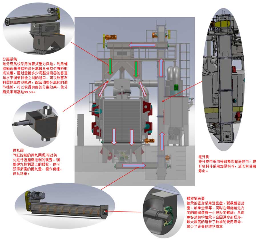 循环系统由螺旋输送器、斗式提升机、丸砂分离器、气动供丸闸阀、溜丸管等组成。