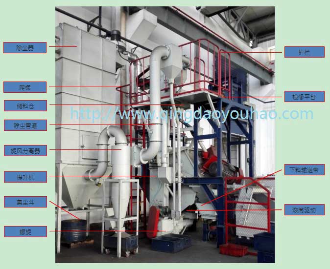 15. | 除尘系统 | 1 | 总风量:约8000m3/h 清理室:约5000 m3/h 分离器:约3000 m3/h 风机型号: 4-72-4.5A 7.5KW | |