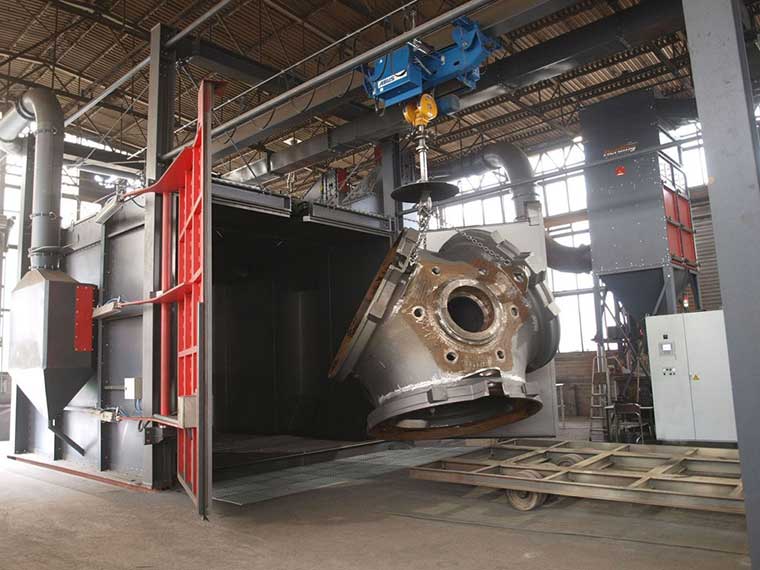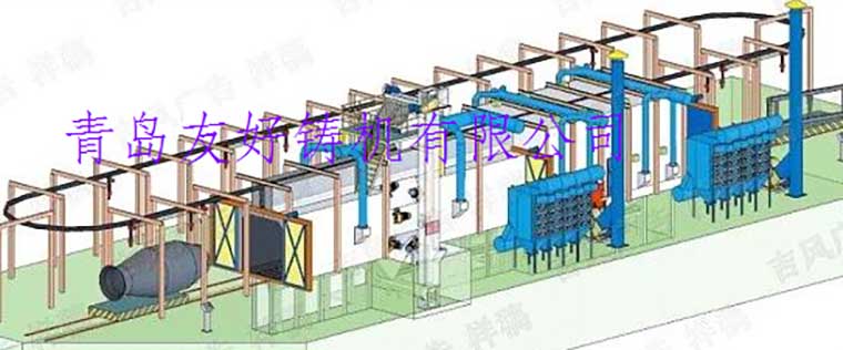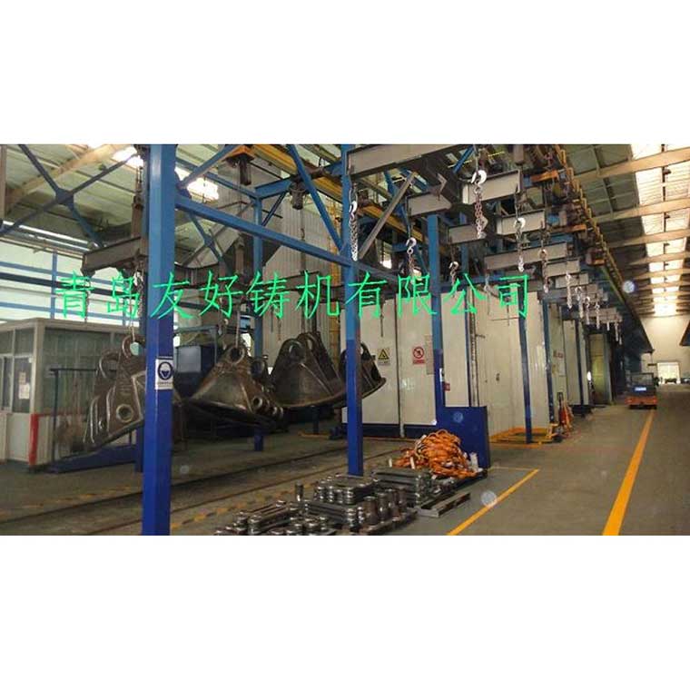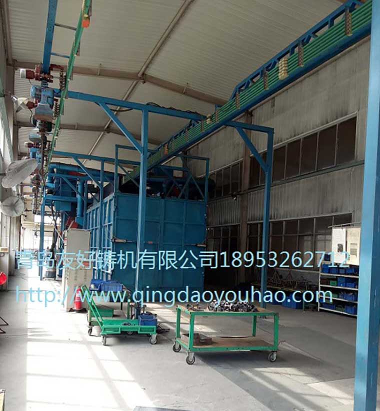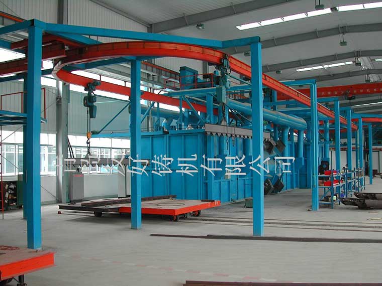 产品名称:工程机械、建筑机械等行业大型构件抛丸清理机 产品说明:QT37系列工程机械抛丸清理机主要用于工程机械、建筑机械等行业。 抛丸机其工作原理是:大工件由两个变频调速电动葫芦吊运快速到达清理副室,慢速匀速通过抛丸室,对大部件周身进行抛丸清理,抛丸后进入后附式对未清理到的工件死角采用喷丸罐进行喷丸清理;小工件由1个变频调速电动葫芦吊运快速到达清理副室,进入抛丸室停止,工件自传装置带动工件自转,对小部件进行抛丸清理。 吊钩轨道可采用环形结构,摆床抛丸机,卸件后的电动葫芦快速回到装料位。抛丸机若采用3组电动葫芦,喷砂房可实现装料、抛丸、卸料流水线工作,提高抛丸的效果和效率。 用 途:Q37系列工程机械抛丸机主要用于钢结构件、铸件、工程机械部件及其他零件的表面清理及强化。 技术说明: