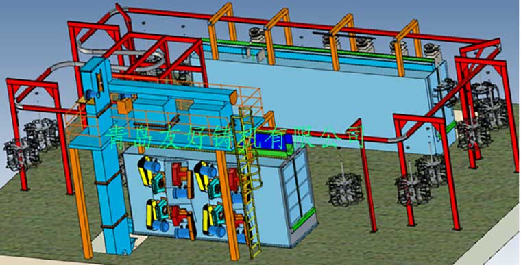 (3)悬链式抛丸机链条的长度和布置可按用户要求设定,装卸铸件作业点布置灵活,易与上下工序组成流水作业。
